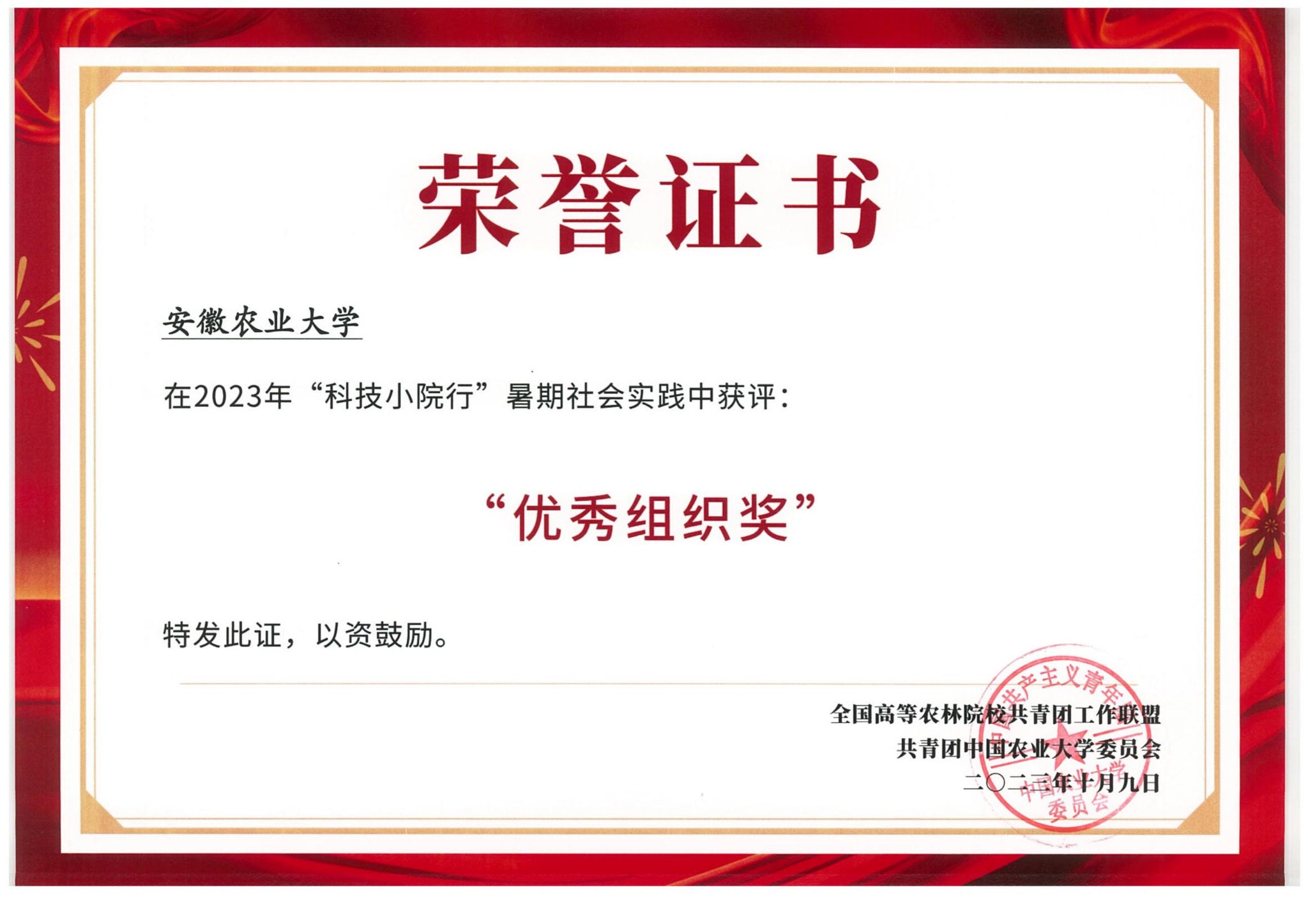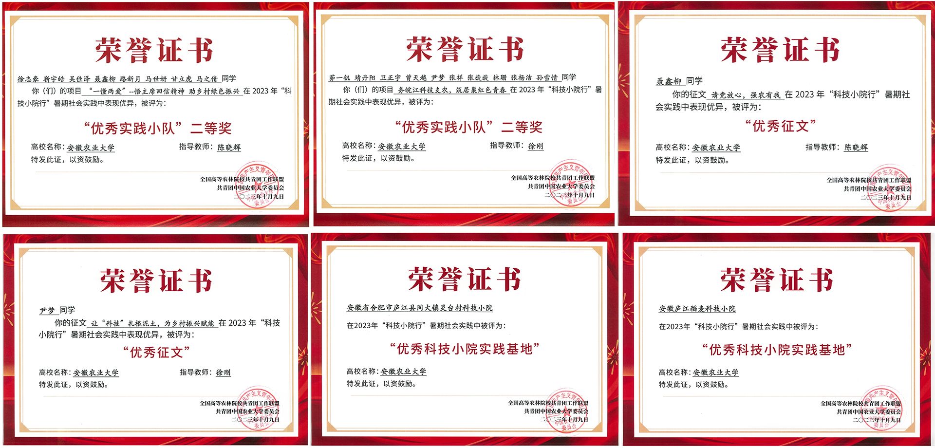 2023年6月至10月,由全国高等农林院校共青团工作联盟、农林高校资源环境类公司党建研究会共同开展的2023年科技小院行社会实践活动评优结果揭晓,太阳成官网“‘一懂两爱’——悟主席回信精神 助乡村绿色振兴”实践团队、“悟皖江科技支农,筑居巢红色青春”实践团队获优秀实践小队二等奖,安徽庐江稻麦科技小院、安徽省合肥市庐江县同大镇灵台科技小院获优秀实践基地。分别由尹梦、聂鑫柳两位同学撰写的两篇征文获优秀征文。太阳成官网获优秀组织奖。