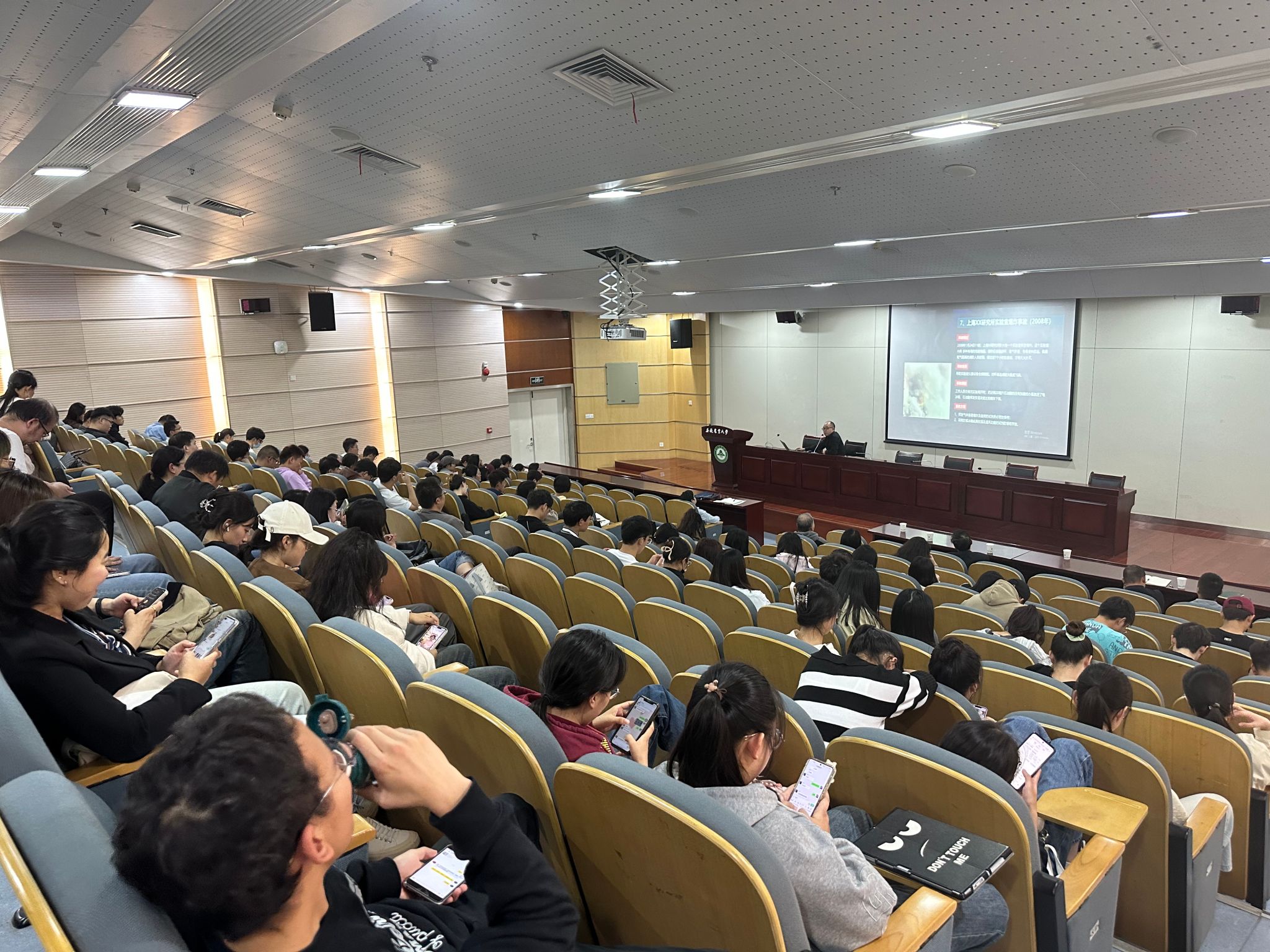 杨勇从近年来高校实验室事故众多案例入手,深入剖析了各类典型安全隐患,用生动平实的语言向现场师生发出警示——“实验室安全人人有责,没有旁观者,一旦发生事故受害最大的是自己”,希望每位同学都能从自身做起,规范操作,不伤害别人,互相提醒、互相监督。杨勇还就危险化学品管理适用法律法规进行了解读,并对实验室废弃物管理提出了很多宝贵意见,包括收集、暂存和贮存化学类废弃物需要注意的风险因素等。