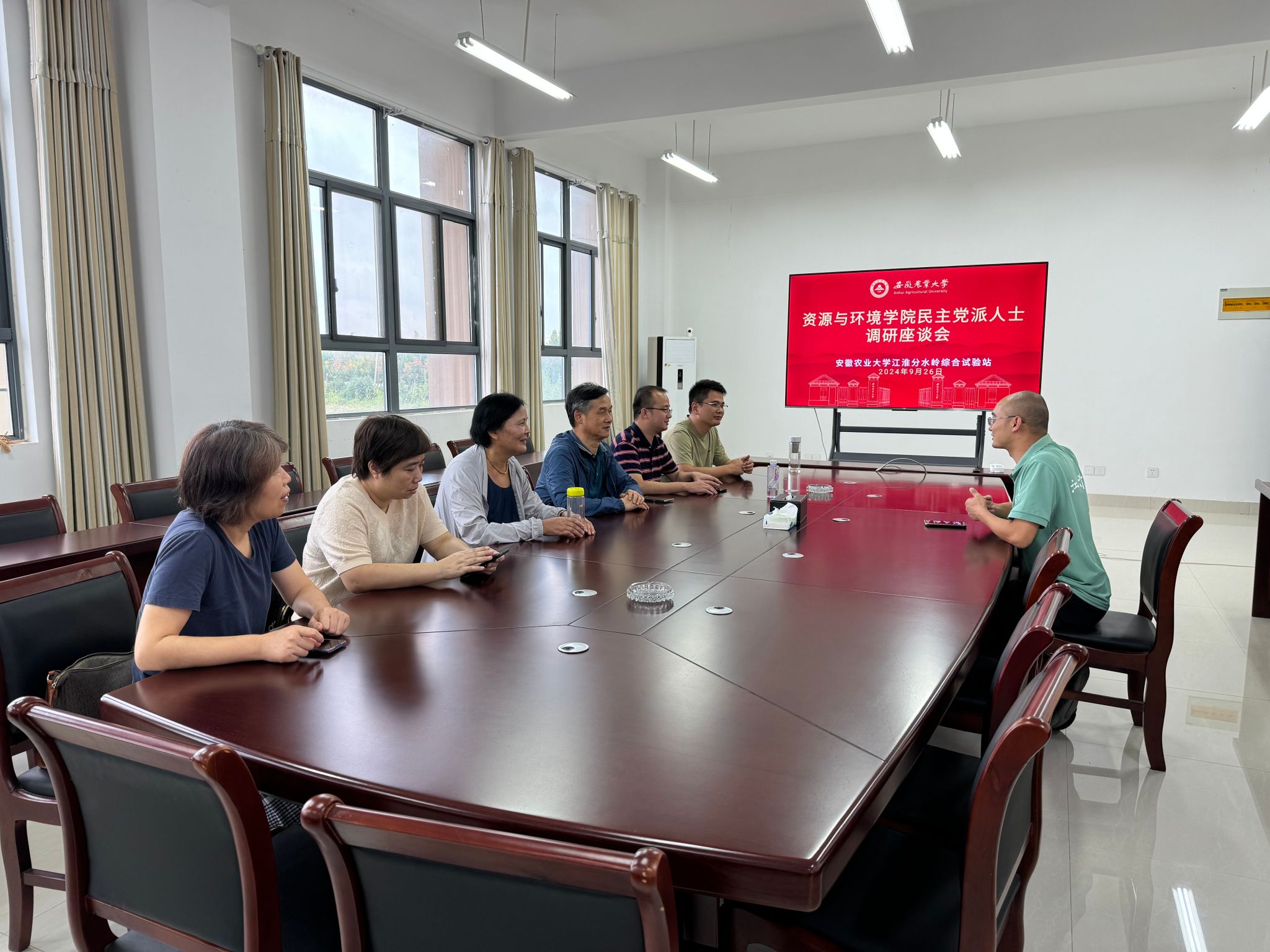 调研组来到江淮分水岭综合试验站,座谈会上,试验站负责同志介绍了试验站在服务地方农业产业发展、服务学校教学科研等方面所做的工作,并参观了试验站农区草牧业标准化生产示范基地、果树种植试验示范基地、稻渔共生试验示范基地。学院民主党派人士表示将利用自身专业优势,做好院站协同,共同发挥学院与试验站在人才培养、科学研究、创业孵化与社会服务等方面的管理优势和资源优势,以新质生产力赋能乡村全面振兴。