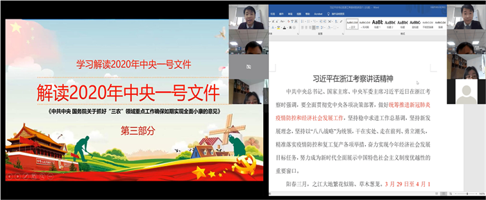 支部通过线上会议的方式,以微党课形式学习了习近平总书记在浙江考察时重要讲话精神和“2020年中央一号文件”精神。部分党员教师结合自身学科专业及业务工作交流学习心得体会。