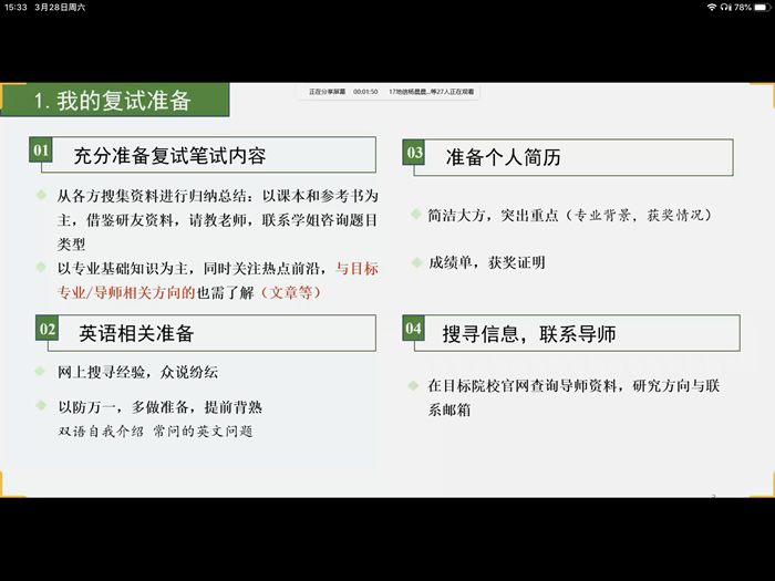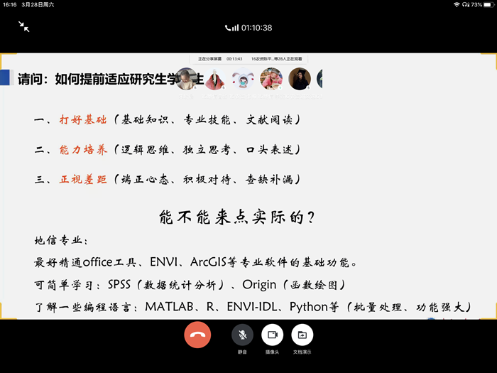 5位同学分别从复试材料的准备、信息搜集、面试环节、面试礼仪、心态调整等方面向与会党员介绍了自己的复试经验和学习体会:就读于中国农业大学的张帅会前集中收集了复试中考官的常见提问,与参会员工进行分享;就读于中国地质大学的李鑫就联系导师的注意事项,结合自身经历进行了交流;就读于南京农业大学的殷玲威叮嘱考生,务必按照报考院校的要求扎实准备复试中的笔试环节;就读于华南农业大学的曹臻更是提醒了大家复试中谦逊稳重、自信大方的重要性;就读于中国地质大学的江道阳以第一视角分享了他在地大的研究生日常学习生活和所在支部的建设情况,就如何提前适应研究生学习生活提出自己的建议,并号召支部全体党员在疫情防控期间,强化责任担当意识,充分发挥员工党员的先锋模范作用。