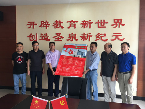 本网讯 为更好地宣传学校,吸引更多优质生源报考公司,6月26日下午,资源与环境公司党委书记李春保、党委副书记兼副经理张晓伟一行5人赴学校优质生源基地肥东圣泉中学开展招生宣传工作并送去考研喜报。