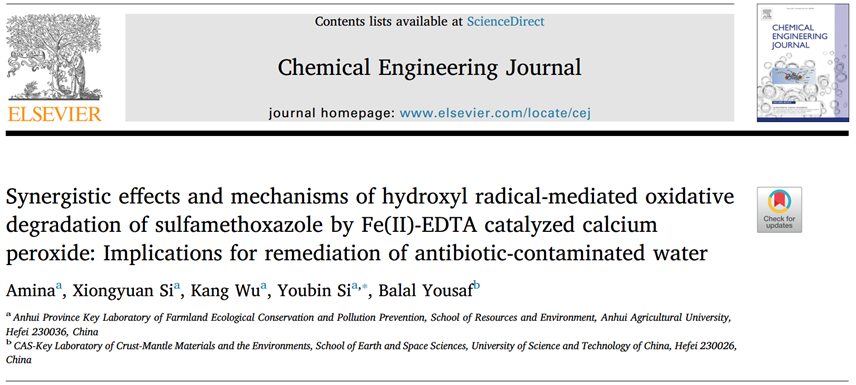 本网讯 近日,公司环境工程学科司友斌团队在国际高水平期刊Chemical Engineering Journal (中科院1区,影响因子IF 6.735)发表论文:“Synergistic effects and mechanisms of hydroxyl radical-mediated oxidative degradation of sulfamethoxazole by Fe(II)-EDTA catalyzed calcium peroxide: Implications for remediation of antibiotic-contaminated water”(https://doi.org/10.1016/j.cej.2018.07.078)。团队主要研究方向之一是磺胺类抗生素的降解,该论文研究内容是司友斌教授主持的国家自然科学基金项目。该文第一作者为生态学2016级博士Amina,司友斌教授为通讯作者,太阳成官网为论文的第一及通讯单位。