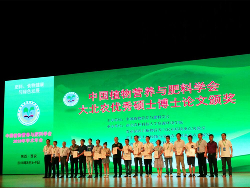 本次年会的会议主题是“肥料、食物健康与绿色发展”,会议设立了1个主会场、10个分会场及“一带一路”肥料科技创新与国际合作论坛,交流形式包括大会报告、分会场报告和墙报交流。年会开幕式上,中国植物营养与肥料学会向获得大北农第二届优秀硕士学位论文的六位作者及其指导教师颁奖,学院郜红建教授指导的硕士研究生陈晨同学获得了大北农第二届优秀硕士学位论文奖。