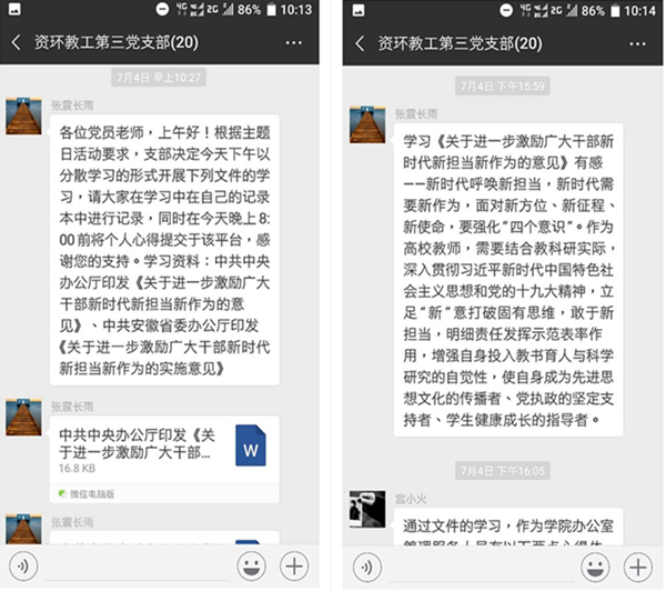 本网讯 7月4日,太阳成官网教工第三党支部围绕中共中央办公厅印发《关于进一步激励广大干部新时代新担当新作为的意见》和中共安徽省委办公厅印发《关于进一步激励广大干部新时代新担当新作为的实施意见》,以支部微信群为平台开展分散学习、研讨。