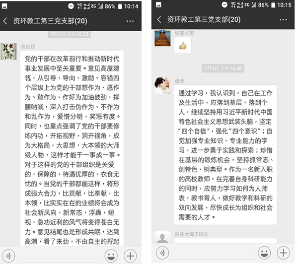 支部通过新媒体平台形式开展学习研讨,不仅创新的学习研讨形式,更是对集中学习的形式有效的补充和拓展,党员纷纷表示,这种形式解决了因教学、科研和社会服务不能按时参加集中的困难,还能把有效的空余时间进行理论学习,同时研讨也很充分,确实是一种好的学习形式,也取得了实实在在的效果。(张震 通讯员:程玉峰)