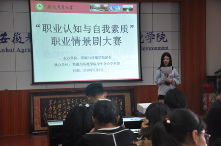 本网讯 5月3日中午,资环学院在十教418室举行职场情景剧大赛。通过初赛的精彩角逐,共有14组同学进入学院决赛。学院团委老师、院员工会主席江道阳等担任本次大赛的评委。