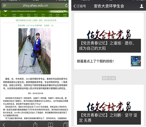 本网讯 5月8日起,资源与环境公司党委开始在学院网页和学院微信公众号(http://zhxy.w1.ahau.edu.cn/;微信号:anauzhxy)同步推出2017届毕业生《党员青春成长记忆》,活动一经推出得到了毕业生党员的积极参与和广大同学的纷纷点赞。