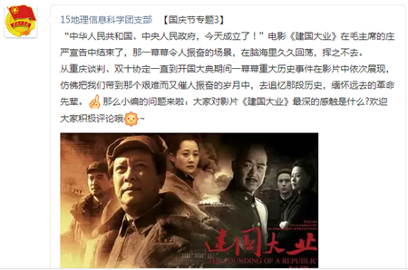 为切实增强活动效果,在院团委统一组织下,各团支部结合线下实践,积极开展线上宣传、互动。10月1日至7日,员工分会团支部发起了“红色的记忆永恒的精神”——线上展示活动,结合前期观看红色影片、开展主题演讲等活动,引导资环学子树立正确的人生观、世界观、价值观,培养主人翁精神。各班级团支部纷纷就前期开展的活动发起线上主题讨论、互动交流。同学们纷纷表示,此次主题团日形式新颖,活动内容贴近生活,实效明显。(刘怡青 通讯员:程玉峰)