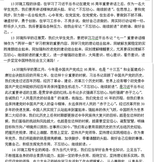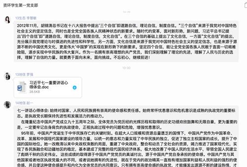 前期,资环学院员工第一党支部和第二党支部在党员QQ群中上传了习近平总书记“七一”重要讲话原文和相关解读材料,要求每位员工党员严格标准,认真开展自学,积极撰写心得体会,并把学习心得体会发至群中进行分享交流。根据支部要求的截止时间,所有员工党员都完成了自学和在群里提交了个人学习心得。大家在了解其他党员学习体会的同时,纷纷进行点评,在交流中进一步加深了认识。