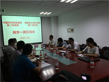 中国农业科学院资划所与安农大资环学院于2015年6月12日签署战略合作协议,目前已经在人才培养、团队建设、学术能力提升以及成果转化等方面形成了广泛合作与交流。本次党支部之间的交流,是以“两学一做”为契机,进行深入合作与交流的一个组成部分。两个支部将进一步形成“两学一做”学习教育交流内容框架,将“学、做、改” 落在细处、落在实处,不断把学习成果体现在具体工作中,切实增强基层党组织的凝聚力和战斗力,切实发挥党员先锋模范作用。