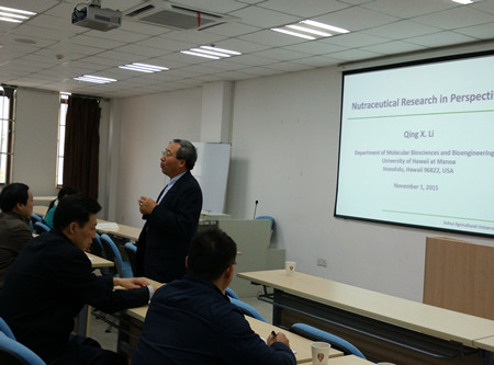 11月1日下午,美国夏威夷大学李庆孝来校进行学术交流和工作,并作了《营养品研究前景》的学术报告。报告会由资环学院经理郜红建主持。
