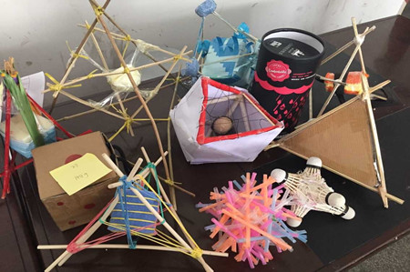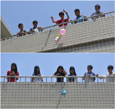 “鸡蛋撞地球”作为公司科技活动月的子活动之一,要求选手们利用日常生活废品完成对鸡蛋保护装置的制作,然后对装置进行高空自由落地测试,根据鸡蛋的定向落点、破损程度和装置重量及下落时间等进行评比。如何保证鸡蛋从高空坠落而不破裂,如何使鸡蛋落入地球“靶心”,这可十足考验了参赛者们的想象力和创造力,他们充分利用一切可利用的材料,有采用传统的三棱锥把鸡蛋“悬”在其中 ,有用气球做降落伞,还有用筷子制成的螺旋桨,形状千奇百怪。