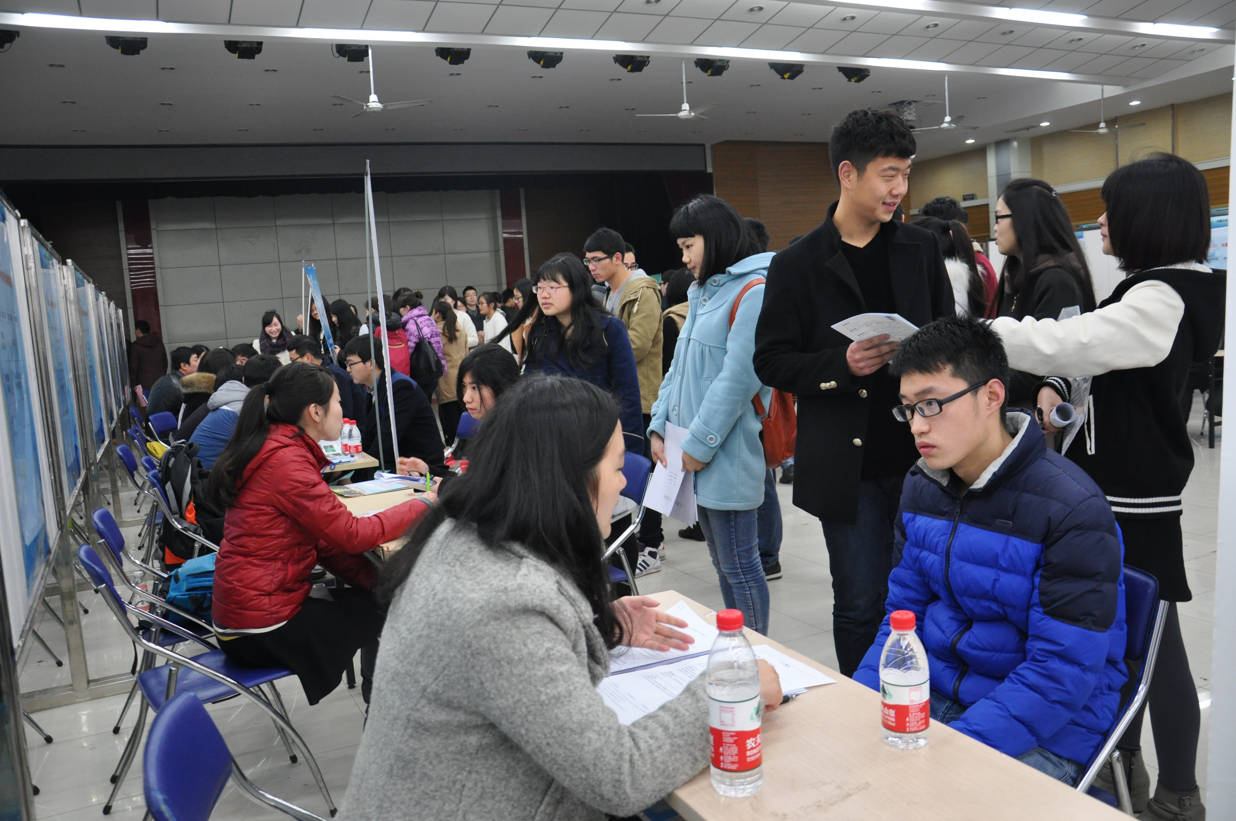 招聘会现场人头攒动,气氛热烈,几百名本院和相关专业的毕业生参加了招聘会,他们准备充分,认真选择职位,积极自荐。现场,招聘人员就公司概况、相关待遇、职业前景等情况与应聘者进行了充分的沟通与洽谈,有的单位对应聘员工进行了面试,也达成了初步的招聘意向。有人单位对公司2015届毕业生的生源质量和同学们的就业准备给予了肯定。
