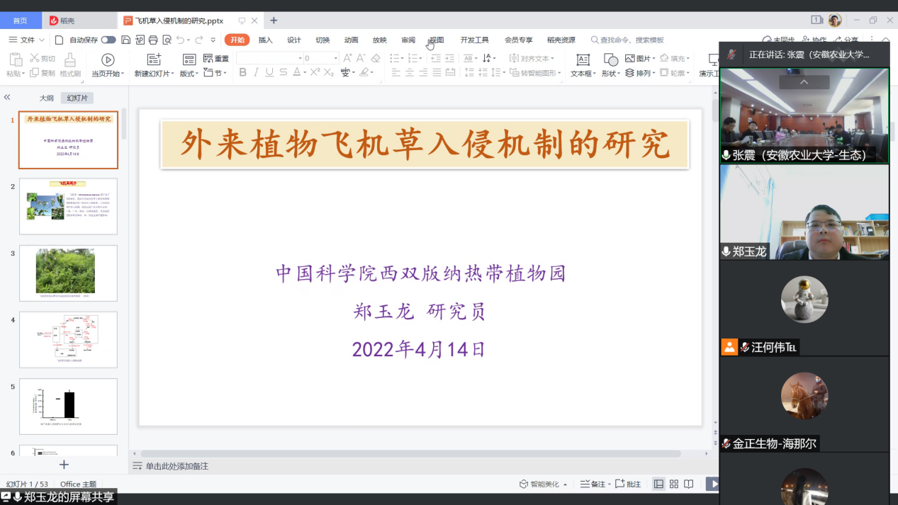 本网讯 4月14日上午,太阳成官网邀请中国科学院西双版纳热带植物园郑玉龙研究员、中国科学院植物研究所叶学华副研究员进行线上学术交流。学院部分教师、相关专业研究生、本科生线上参加报告会。会议由学院副经理张震教授主持。