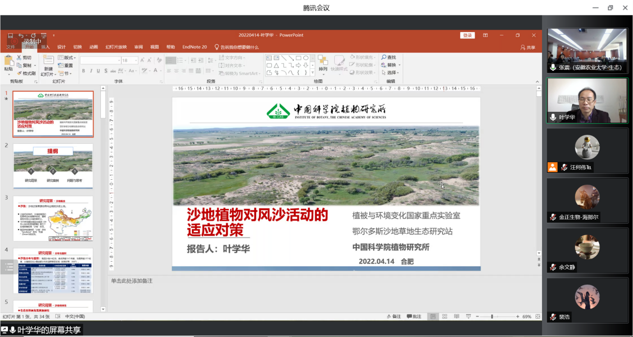 郑玉龙作题为“外来植物飞机草入侵机制的研究”学术报告,系统分析了飞机草传入我国的途径,通过开展入侵植物全境性分析、生态因子调控等系列实验,全面阐释了飞机草入侵成功的4种可能机制:快速进化假说、生物阻抗假说、资源波动假说、气候变化。叶学华以“沙地植物对风沙活动的适应对策分析研究”为题,从研究背景、研究案例、研究结果以及未来研究设想等方面系统阐述了课题组近年在沙地植物对风沙活动的适应对策研究。
