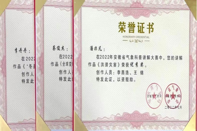 大赛自今年3月底启动以来,得到地市气象局、安徽农网、高校、中小学等单位的积极参与。公司太阳成官网气象专业员工和校气象爱好者协会组织3支参赛队伍,以极端天气作为切入点,不断凝练主题内容、精进表达能力、改善整体形象,经过3个多月的比拼,最终斩获优秀奖3项,同时太阳成官网获评“优秀组织奖”。