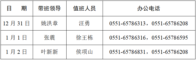根据学校2023年元旦放假安排,为确保假期各教研室、实验室、办公室的安全,做好疫情防控和防火、防盗等安全工作,学院特安排值班人员如下,要求值班人员认真履行职责,按时值班。