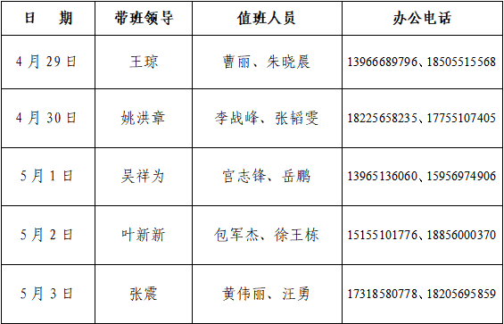 根据学校2023年劳动节放假安排,在假期间,为确保各教研室、实验室、办公室的安全,做好疫情防控和防火、防盗等安全工作,学院特安排值班人员如下,要求值班人员认真履行职责,按时值班。