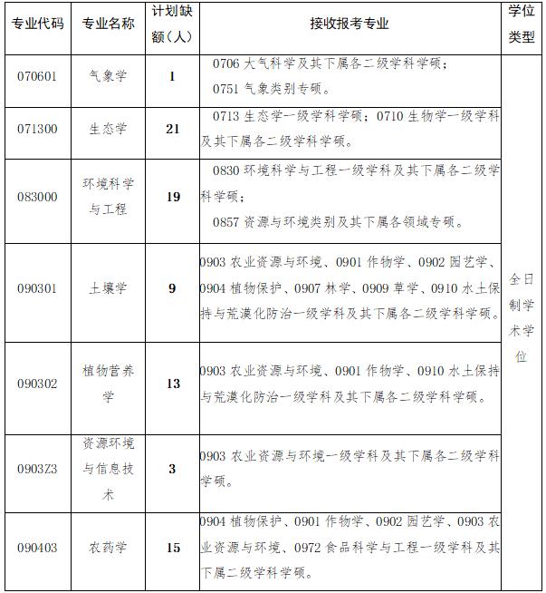 公司气象学、生态学、环境科学与工程、土壤学、植物营养学、资源环境与信息技术、农药学等专业拟接收调剂生源。调剂招生计划如下: