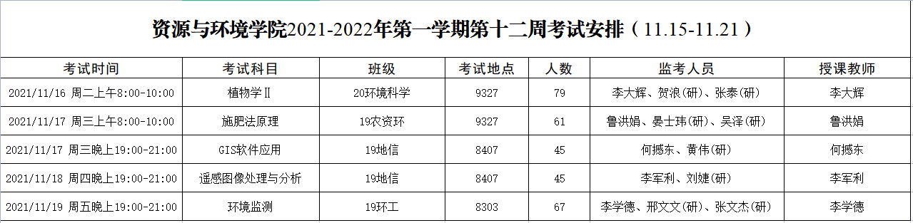 太阳成官网2021-2022年第一学期第十二周考试安排