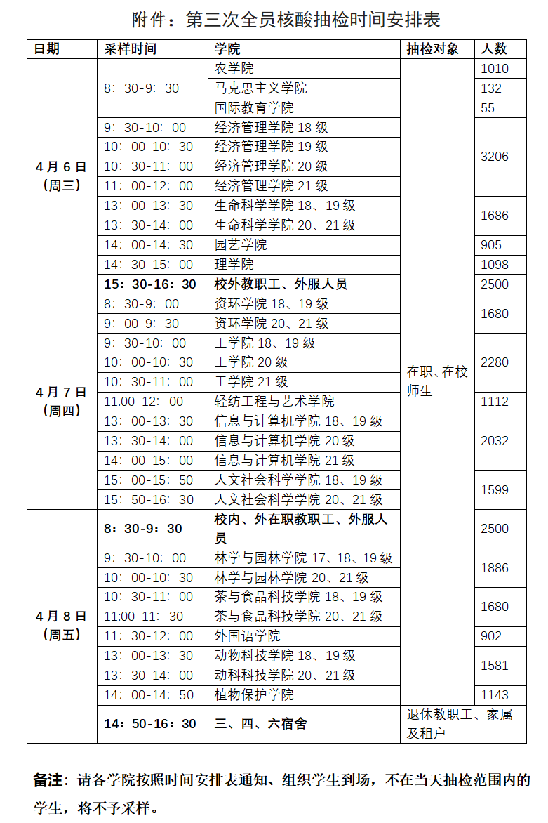 各单位要高度重视,切实履行疫情防控主体责任,严格配合做好核酸抽检工作,精准通知到每一名师生员工,严格按照时间点参检,确保不漏一人,各学院主要负责人要到场指挥,并指定专人配合现场人员调度,员工班级由辅导员带队负责,确保本单位核酸检测工作顺利、有序、高效。各参检单位开展核查,于当天下午四点前报送核酸检测的师生人数,及时了解未做原因并处置。
