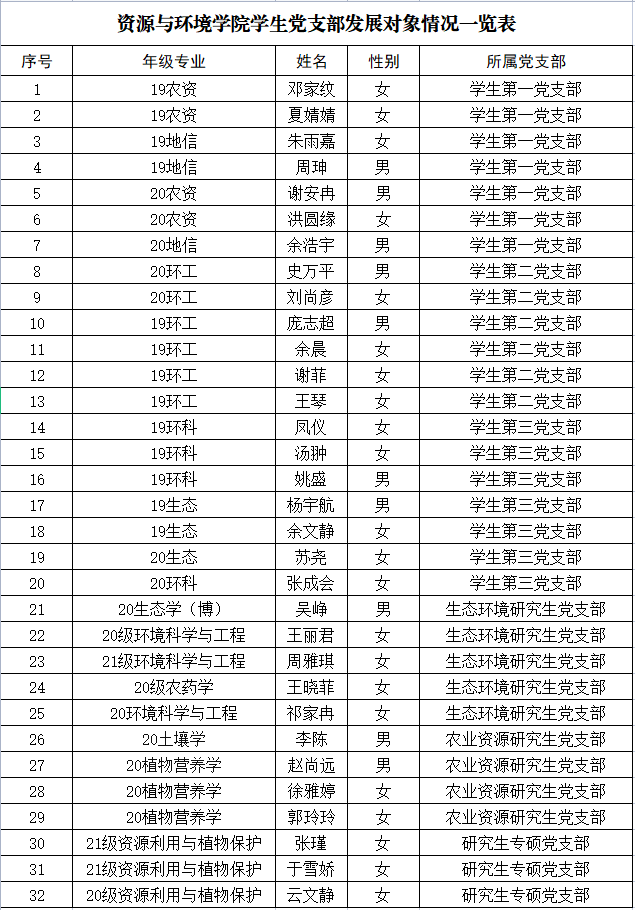 根据本人申请、组织培养和考察,经学院研究生党支部支委会讨论,拟确定邓家纹等32位同学为建党对象,现将有关情况公示如下。在公示期内,欢迎广大党员、师生通过信函、电话或直接到党委反映公示对象的思想品质、现实表现、培养教育等方面的情况。公示无异议后,报公司党委会研究确定本期发展对象。