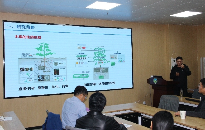 刘东阳教授作题为《哈茨木霉菌防控土传枯萎病的分子机制研究》的报告。他首先介绍了木霉菌与芽孢杆菌在生物防治中的应用潜力及其共存难题;随后,详细讲解了能与之协同互作的木霉突变株M33的诱变筛选过程,并重点阐述了关键拮抗物质Bacilysin的作用机制及其转运蛋白TgMFS4的功能;最后,基于该组合在根际实现的高效定殖与免疫激活效应,系统剖析了微生物跨界互作在土传病害绿色防控中的重要作用。