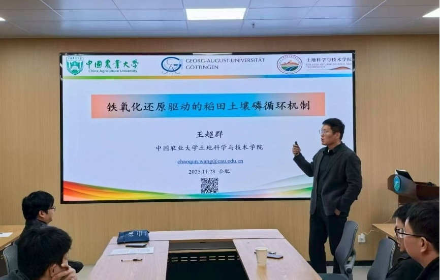 王超群教授作题为《铁氧化还原驱动的稻田土壤磷循环机制》的报告,详细阐述了铁循环在土壤磷活化与固定中的驱动作用。报告围绕稻田干湿交替的环境特点,解析了铁氧化还原过程对不同形态磷(尤其是Fe-P)转化与有效性的调控机制。王教授还特别强调了长期淹水条件下Fe-P对水稻磷营养的贡献,为通过水分管理优化磷肥利用提供了新视角。