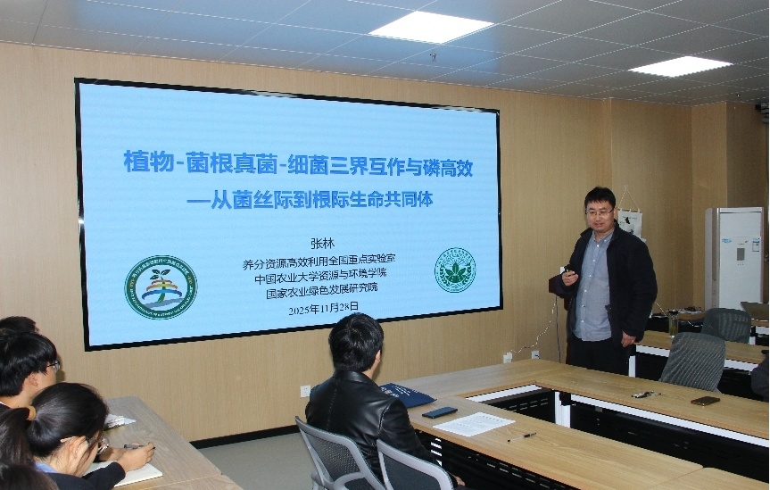 会上,张林教授作题为《植物-菌根真菌-细菌三界互作与磷高效-从菌丝际到根际生命共同体》的报告。报告围绕菌丝际范围与效应研究、菌丝际生物互作、AM真菌第二基因组和基于根际生命共同体理念的菌丝际研究等内容展开,系统阐述了丛枝菌根真菌如何作为关键的生态纽带,驱动根际与菌丝际的养分循环与微生物互作,以实现作物的磷高效利用。