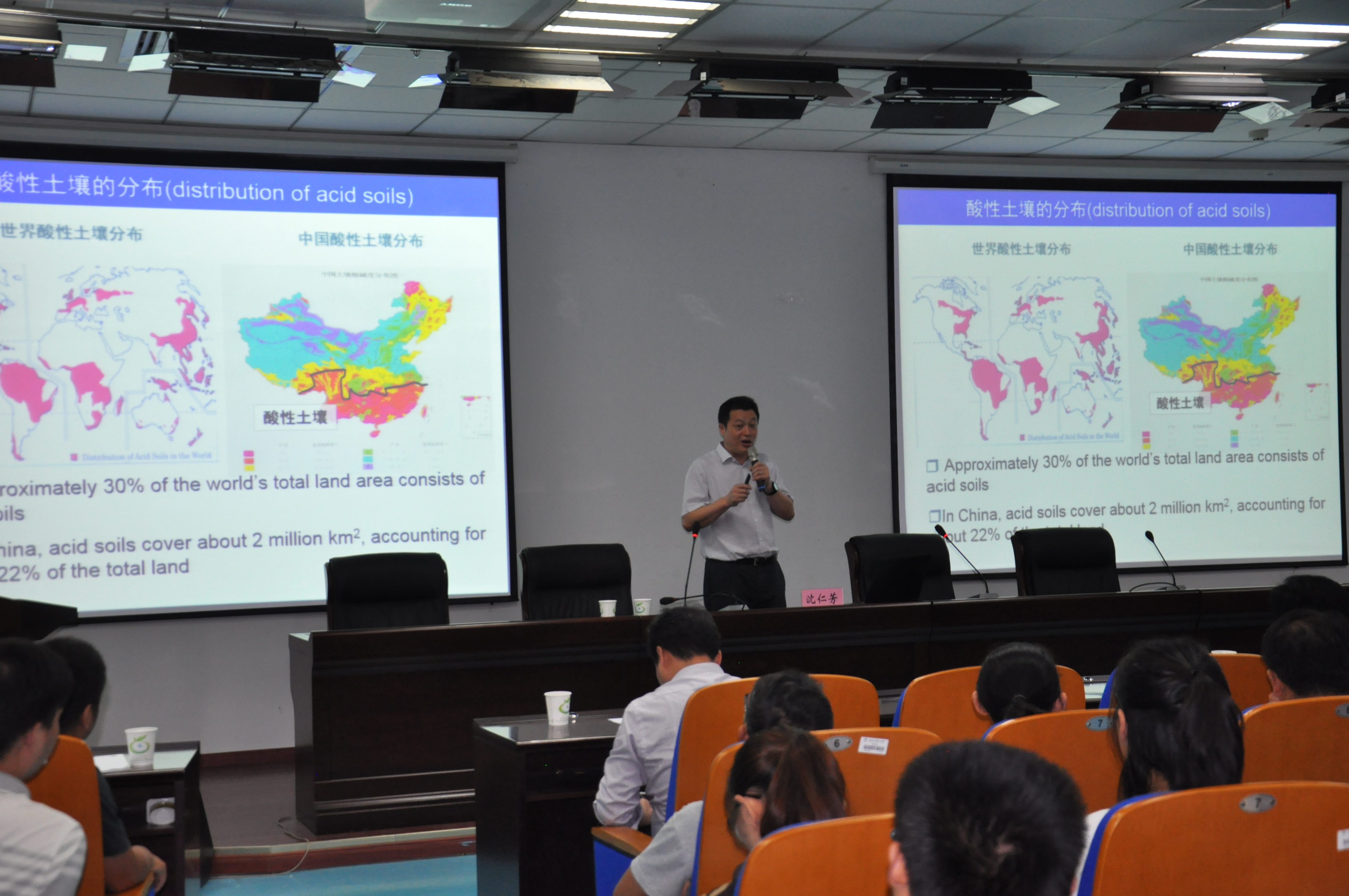 沈仁芳研究员作了题为“酸性土壤可持续利用对策研究”的学术报告。报告会上,沈仁芳研究员从土壤-植物营养的角度,详细地介绍了酸性土壤上植物耐铝机制和氮、磷等养分在植物适应酸性土壤中的作用,以及植物耐铝毒机制理论和土壤肥力的研究。