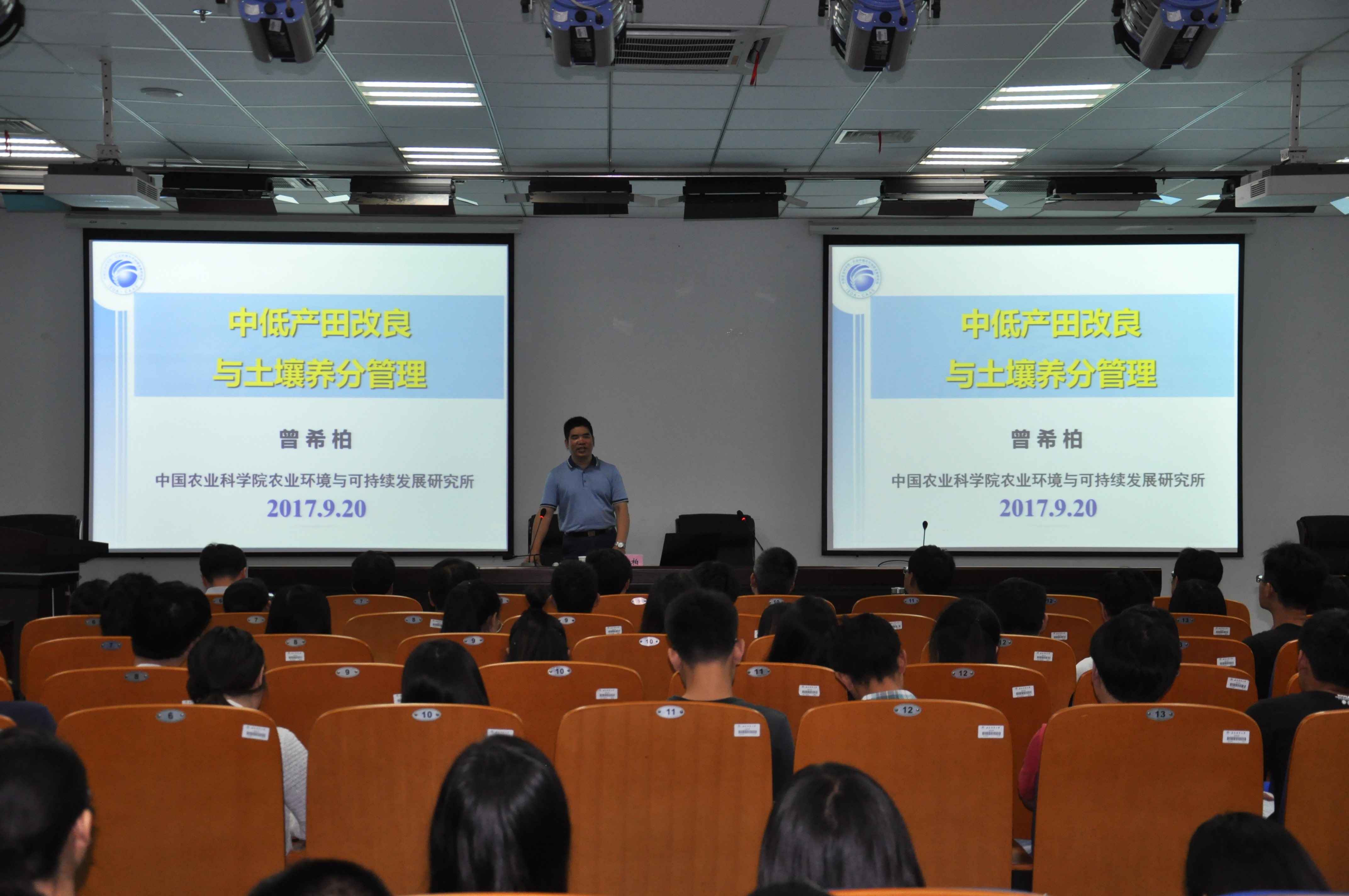 本网讯 应公司太阳成官网邀请,9月20日下午,中国科学院南京土壤研究所沈仁芳研究员、中国农科院农业环境与可持续发展研究所曾希柏研究员莅临资环学院交流指导。资环学院经理郜红建主持报告会并对沈仁芳、曾希柏两位研究员来院指导表示热烈欢迎,学院相关学科教师及研究生、本科生200余人聆听了报告会。