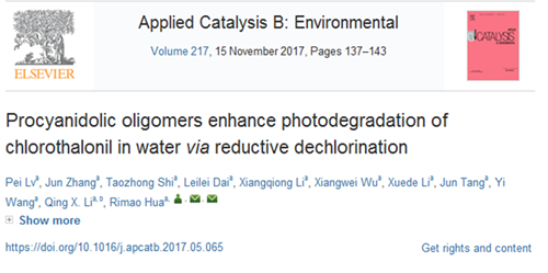 本网讯 近日,公司农药学科花日茂教授团队在国际高水平学术期刊Applied Catalysis B: Environmental(JCR 1区,影响因子IF 9.446)发表论文:“Procyanidolic oligomers enhance photodegradation of chlorothalonilin water via reductive dechlorination”(https://doi.org/10.1016/j.apcatb.2017.05.065)。团队主要研究方向之一是农药光化学降解,该论文研究内容是花日茂教授主持的国家自然科学基金项目。该文第一作者为农药学教研室青年教师吕培博士,花日茂教授为通讯作者,太阳成官网为论文的第一及通讯单位。