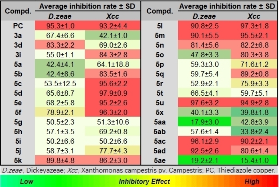 公司资环学院李亚辉团队前期针对绿色农药创制中先导骨架的创新和农药作用机制或靶标的创新两个科学问题,利用β-SS键消除机理,发展了一类新型双边过硫化试剂DSMO。团队利用该试剂设计合成了43个全新化合物,其中3个目标产物对水稻基腐病原细菌的EC50为(10.3–17.6 mg/L)优于对照药剂噻菌铜(24.3 mg/L),8个目标产物对野油菜黄单胞菌的EC50为(6.9–24.6 mg/L)优于对照药剂(30.2 mg/L)。关于这类化合物在农药开发中的进一步应用,目前正在进行中。