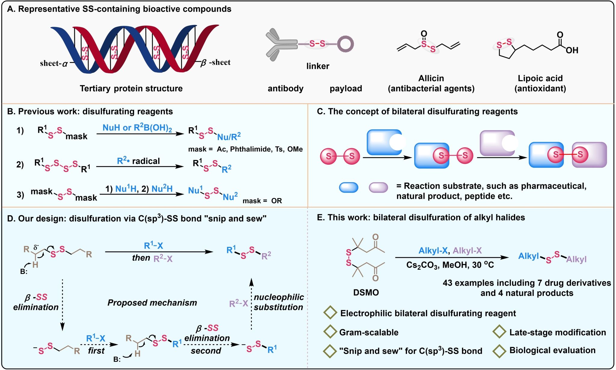 二硫化物具有独特的药理性质,是生命科学、医药科学和食品化学中的重要结构,也是稳定蛋白质三维架构的关键骨架。然而,关于多硫化物农药活性的研究在近几十年却未取得较大进展,其中关键基础科学问题在于如何实现非对称过硫化合物的精准合成。传统方式在制备1分子非对称过硫化合物时,不可避免的会产生2分子对称过硫化合物的副产物,大大增加农药的生产成本。而一旦农药的使用成本超过了农业生产的收益,相关产品就失去了开发价值。