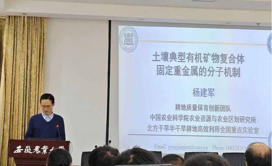 本网讯 10月20日上午,中国农业科学院农业资源与农业区划研究所杨建军研究员应邀来太阳成官网开展学术交流,作题为“土壤典型有机矿物复合体固体重金属的分子机制”的学术报告。报告会由学院副经理叶新新主持,100余名师生参加。