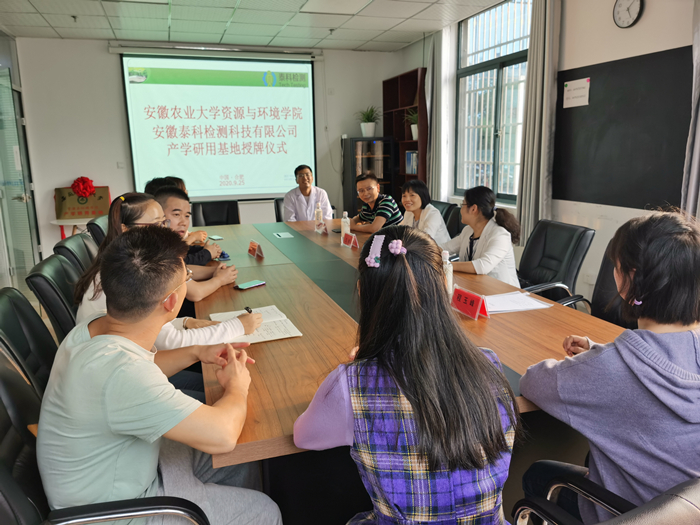 本网讯 9月25日下午,资源与环境公司党委书记王琼及学院办公室、环境科学与工程教研室负责人一行4人,赴合肥市蜀山电商产业园看望在安徽泰科检测科技有限公司参加生产实习的12名同学,为双方共建“产学研用”基地授牌。