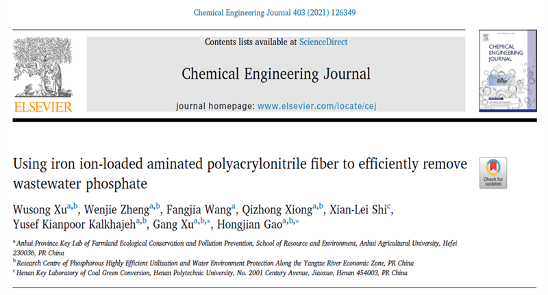 本网讯 近日,国际高水平期刊Chemical Engineering Journal(中科院一区,IF =10.652)在线发表了学院农田生态保育与污染防控安徽省重点实验室、长江经济带磷资源高效利用与水环境保护研究中心磷素高效回收利用与污染防治团队题为 “Using iron ion-loaded aminated polyacrylonitrile fiber to efficiently remove wastewater phosphate”的研究论文。该研究制备了一种新型可循环使用的铁离子负载的胺化腈纶纤维,用于去除与回收废水磷酸盐(https://doi.org/10.1016/j.cej.2020.126349)。