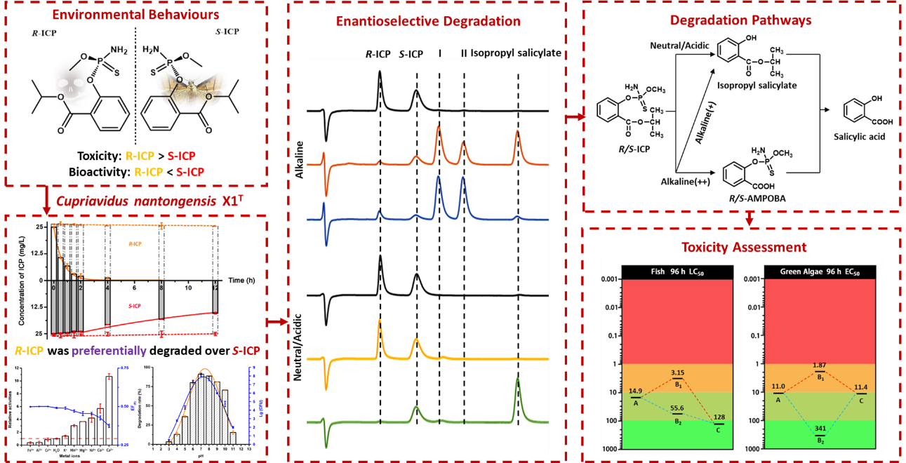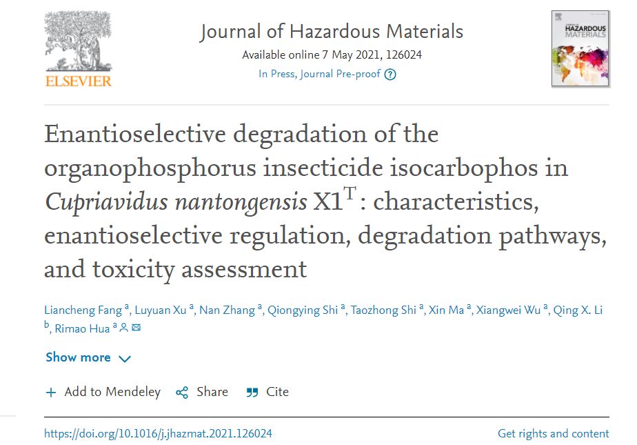 本网讯 近日,国际高水平期刊“Journal of Hazardous Materials (中科院一区Top, IF = 9.038)”在线发表了公司太阳成官网农产品质量安全安徽省重点实验室花日茂教授团队与美国夏威夷大学李庆孝联合开展的题为“Enantioselective degradation of the organophosphorus insecticide isocarbophos in Cupriavidus nantongensis X1T: characteristics, enantioselective regulation, degradation pathways, and toxicity assessment”的研究论文(全文链接:https://www.sciencedirect.com/science/article/pii/S0304389421009882),该论文系统研究了手性有机磷杀虫剂在南通嗜铜菌X1中的对映体选择性降解特性、代谢路径与不同代谢产物毒性,发现了手性有机磷农药在降解菌株细胞膜中的对映体选择性吸收与降解新机制。公司引进人才方连城副教授为第一作者,花日茂教授为该论文通讯作者,太阳成官网为第一单位。