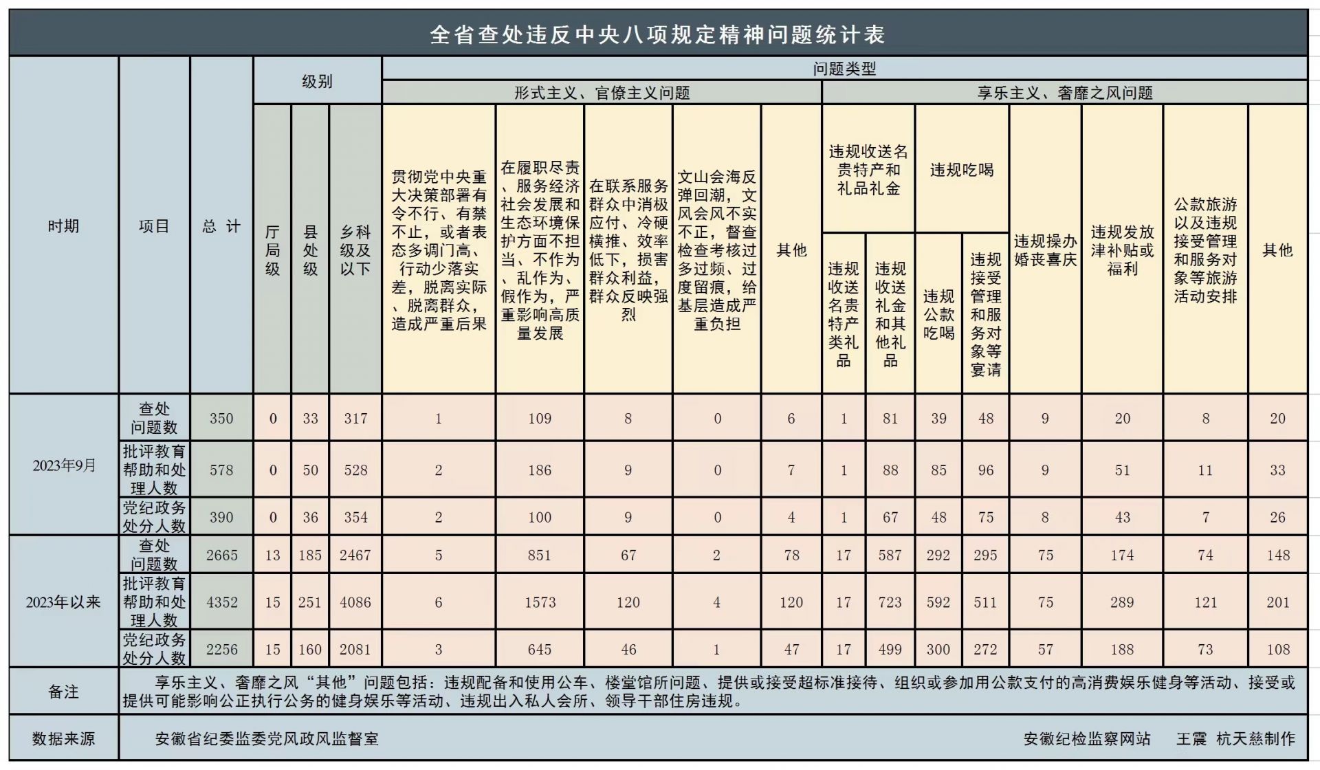 2023年9月,全省纪检监察机关共查处违反中央八项规定精神问题350起,批评教育帮助和处理578人,其中给予党纪政务处分390人,同比分别上升69.9%、78.4%、148.4%。
