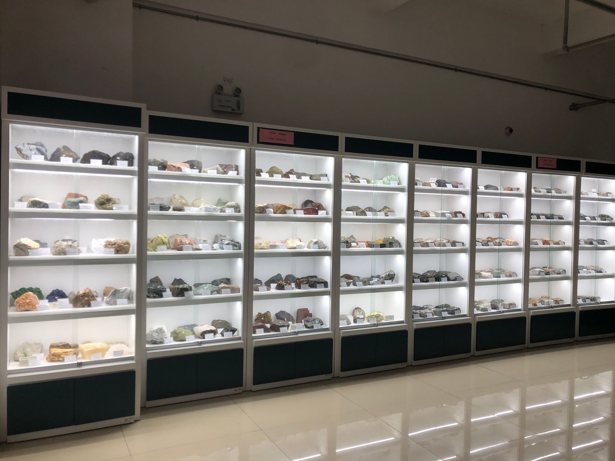 布展区域陈列的展品包含150个常见矿物标本(包括自然元素、硫化物、氧化物、硅酸盐、碳酸盐等)和150个常见岩石标本(包括岩浆岩、沉积岩和变质岩三大类)。岩矿标本的布展将为公司非地质专业的员工学习地学专业基础知识提供更直观的感受,激发他们对地质学科的兴趣,帮助他们深入了解地质学科,让师生可以近距离观察各种岩石和矿物的特征,开阔视野,扩大知识面,从而更加深入地认识、了解、保护自然,感受大自然与地学知识的博大精深。
