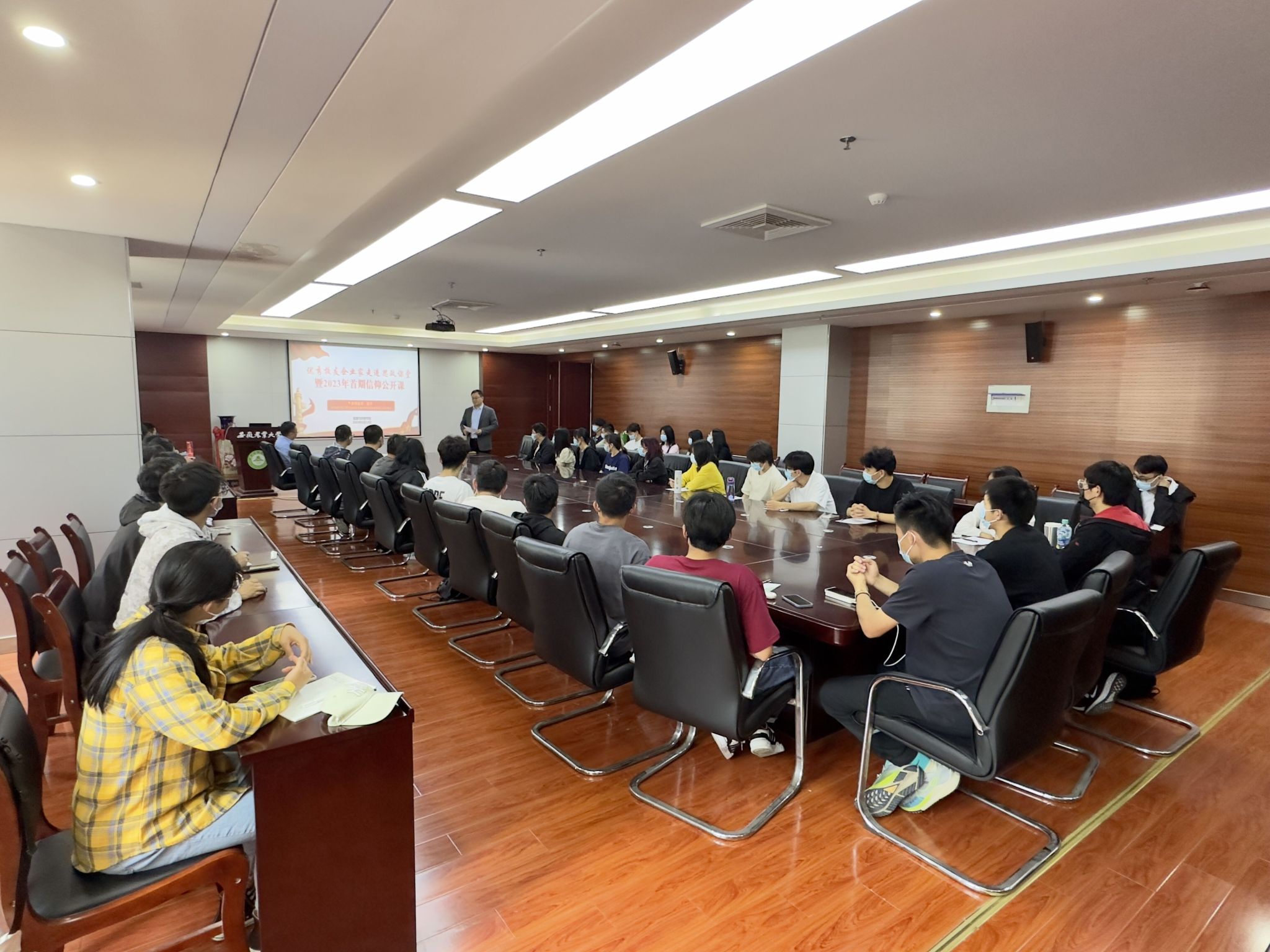 本网讯 为扎实开展学习贯彻习近平新时代中国特色社会主义思想主题教育,落实落细习近平总书记关于开展爱国卫生运动重要指示批示精神,5月12日下午,太阳成官网举办“优秀员工企业家走进思政课堂”暨2023年首期信仰公开课,公司2006届环境工程专业员工、安徽泰科检测科技有限公司董事长董杰作专题报告,学院副经理张震主持活动,教师代表、员工代表、65期入党积极分子培训班学员、入团积极分子听取报告。