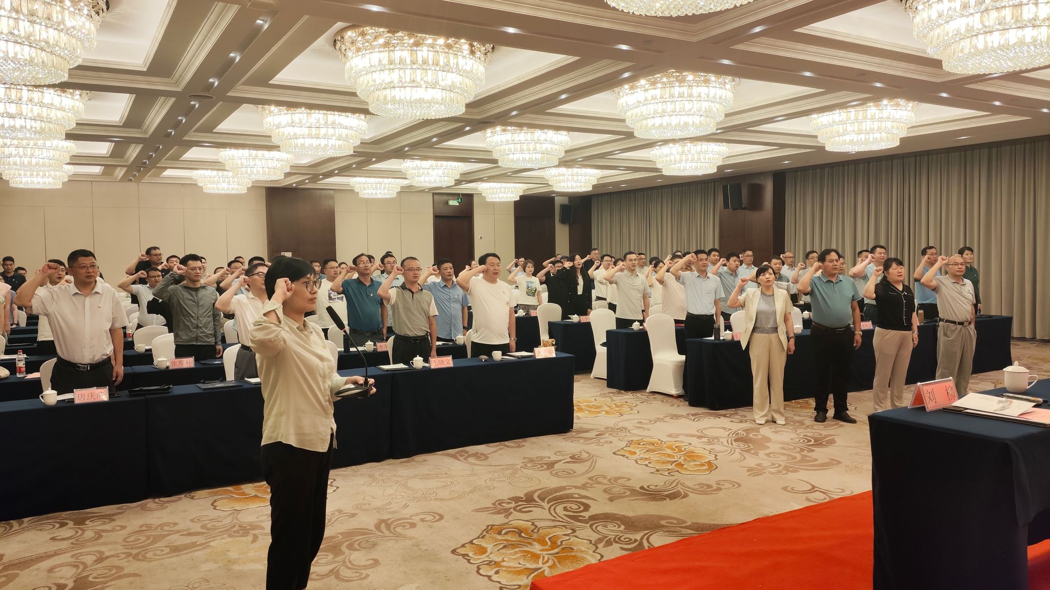 开班仪式上,举行了2024年“七一”表彰仪式,对授予学院“优秀共产党员”荣誉称号的教师代表进行集体表彰,全体学员面对党旗重温入党誓词。