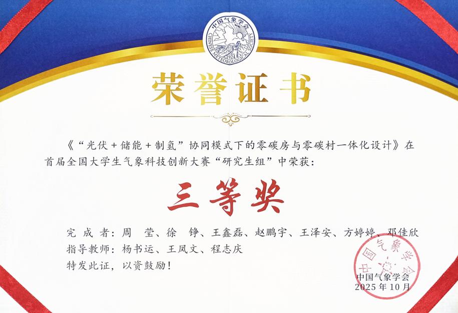 本网讯 首届全国老员工气象科技创新大赛在南京信息工程大学圆满落幕。学院杨书运、王凤文、程志庆老师指导团队提交的《“光伏 + 储能 + 制氢”协同模式下的零碳房与零碳村一体化设计》作品,经过项目路演、现场答辩等环节的激烈角逐,在研究生组中荣获全国三等奖。