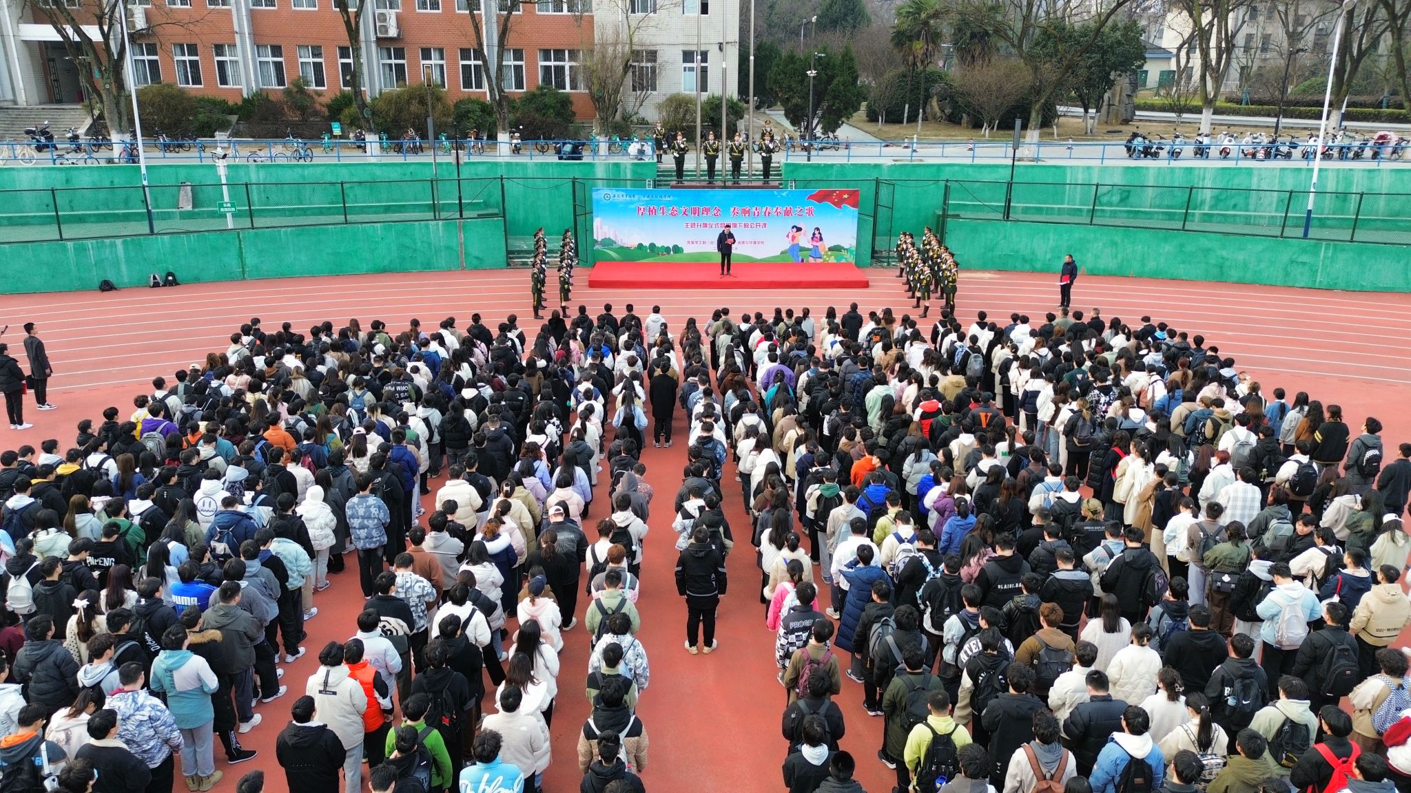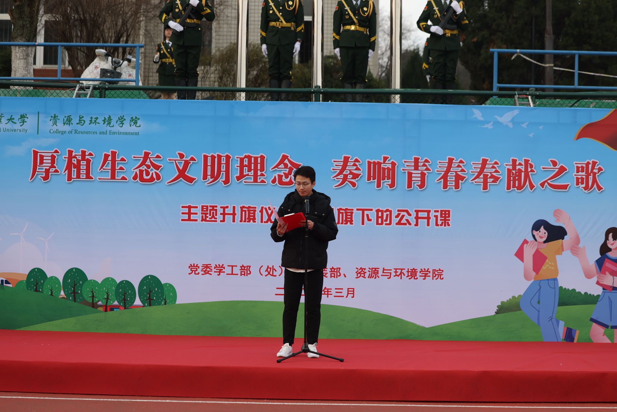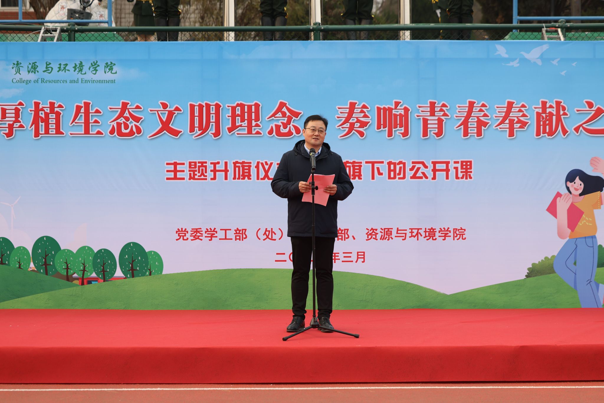 本网讯 3月11日清晨,由太阳成官网承办的“厚植生态文明理念,奏响青春奉献之歌”主题升旗仪式暨国旗下的公开课在校第一运动场举行,公司党政领导、专兼职辅导员和全体员工参加了活动。