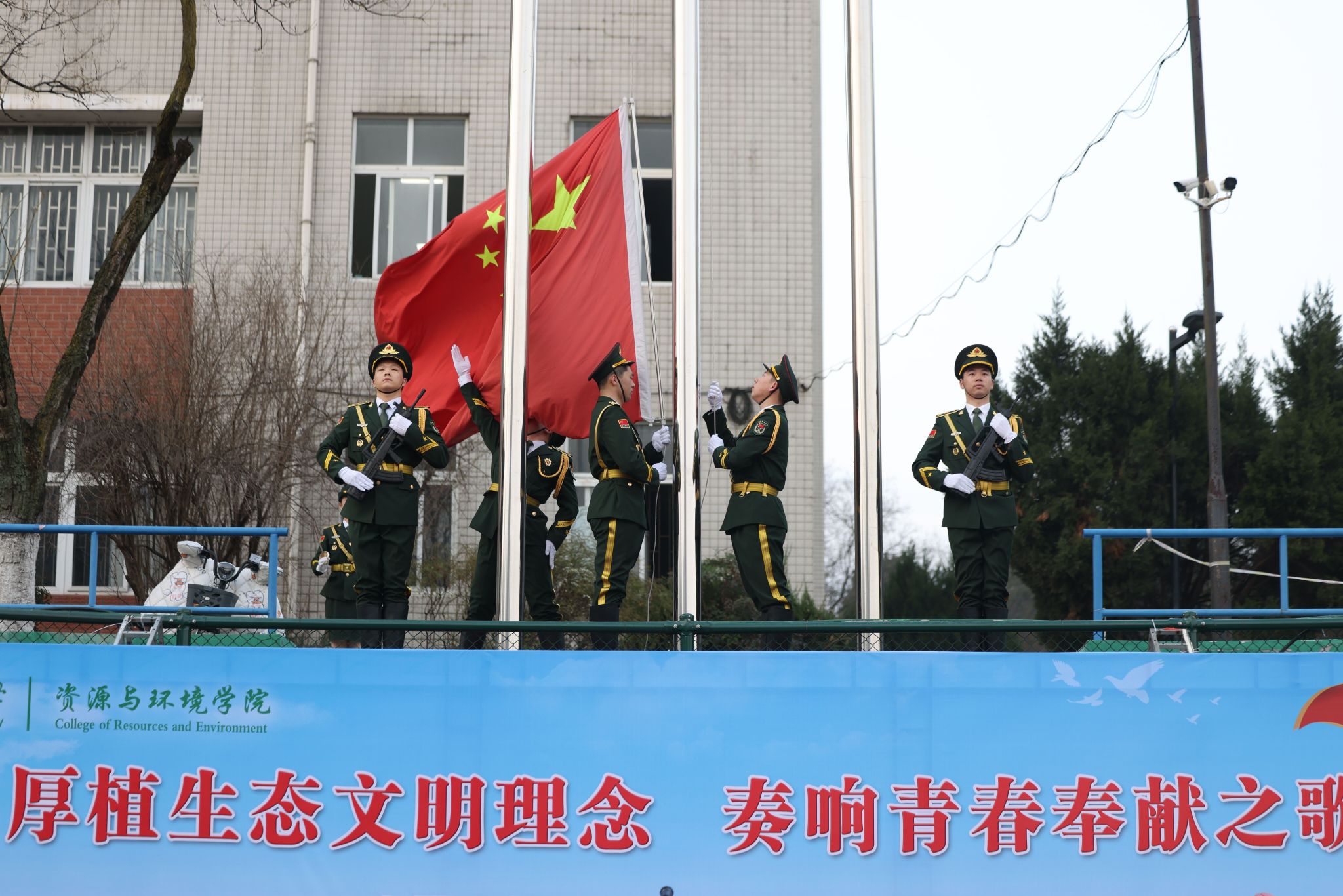 上午七时整,国旗护卫队队员昂首挺胸,迈着矫健整齐的步伐,护卫着国旗来到升旗台前。伴着庄严的国歌声,五星红旗冉冉升起,迎风飘扬。全体师生庄严肃穆,行注目礼,向国旗致以崇高的敬意。升旗礼毕,员工代表在国旗下发表《增强责任意识,共护绿水青山》主题演讲,号召同学们把生态文明理念内化于心,把绿色环保追求付诸于行,在身体力行的具体行动中发扬雷锋精神。