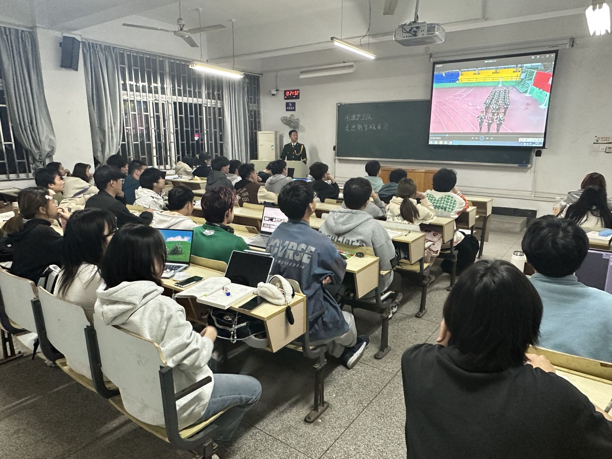 3月6日-3月23日期间,每周一晚19点,经过精心准备,魏郑、柏哲、王文飞3位同学身着国旗护卫队制服深入学院14个新生班级解读国旗法、普及国防安全知识、介绍最新国家形象网宣片《PRC》和《安农大国护最新宣传片》、讲述校园国护生活、宣传应征入伍政策,宣讲爱国主义精神,持续激扬主旋律,传播青春正能量,在场员工反响热烈。