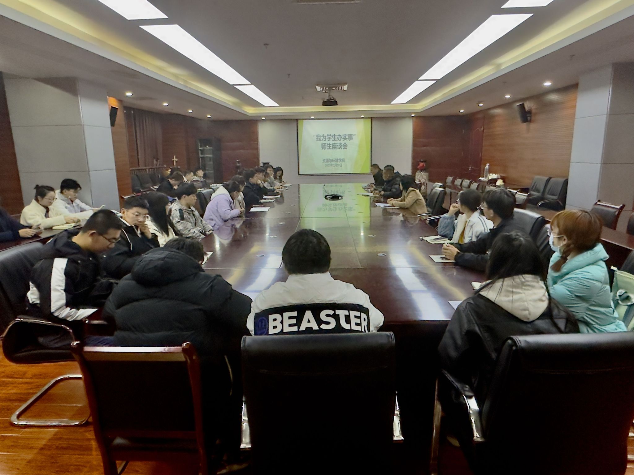 与会领导认真听取每一位员工代表的发言,认真记录同学们提出的疑惑并一一进行解答,同时表示会后将对同学们所提出的建议进一步梳理汇总,逐一向相关部门做好沟通,及时向同学们反馈,积极为同学们营造舒适的校园生活学习环境,持续提升幸福感。