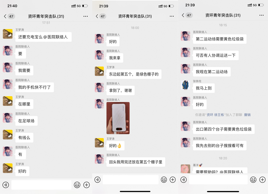 在核酸检测地点,除了各位医护人员忙碌的身影之外,站在外围维持秩序,疏散引导人员的志愿者们也是一道亮丽的风景线。资环青年主动请缨,在做好自身防护的前提下,踊跃参加核酸检测秩序维护工作。面对疫情知难而进,他们贡献自己的时间,不怕辛苦。为方便交流沟通和物品协调,志愿者与医护人员建立微信群,及时提供帮助。他们用实际行动诠释了资环学子有素质、敢担当、勇作为的新时代青年风采。