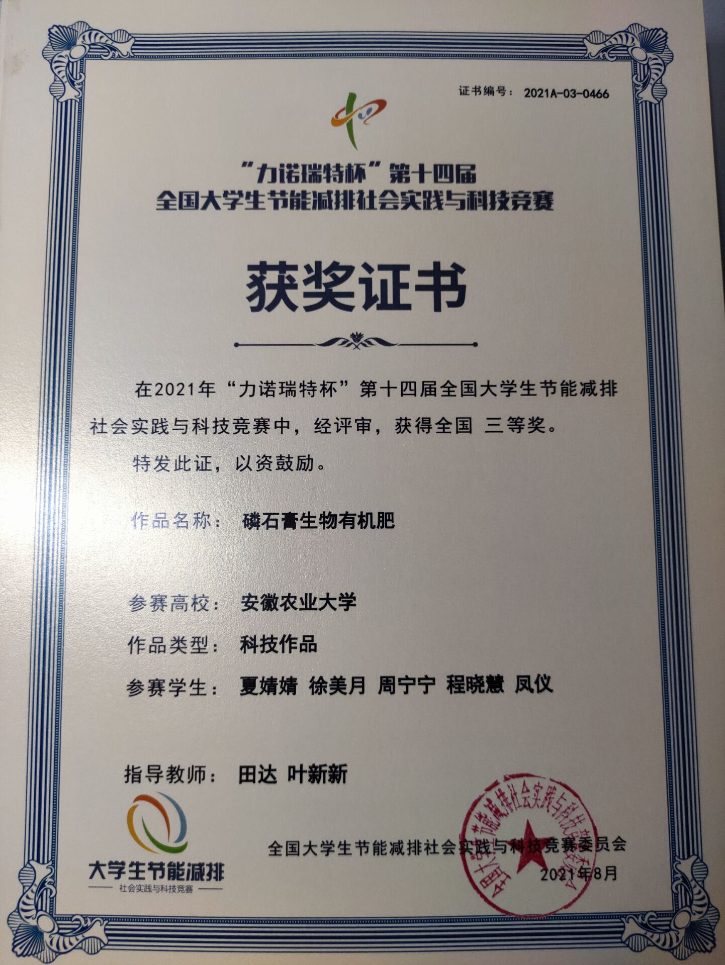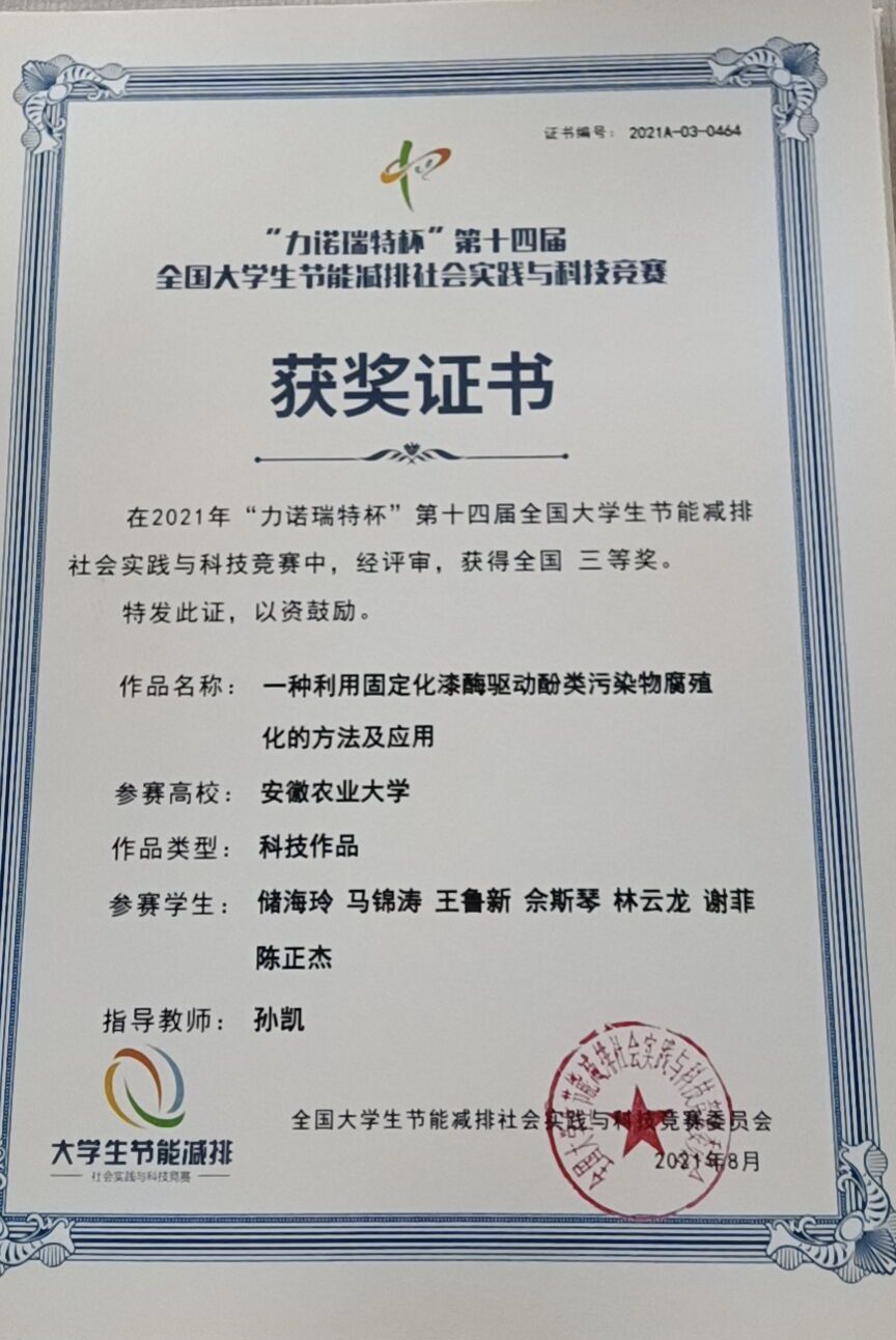 本网讯 2021年8月28日,“力诺瑞特杯”第十四届全国老员工节能减排社会实践与科技竞赛决赛在山东大学落下帷幕。公司选送的15件作品中有7件获全国三等奖,公司田达、叶新新指导的夏婧婧团队《磷石膏生物有机肥》,徐刚老师指导的吴语潇团队《“固废废净污”—新型纤维污水净化材料及装置》,孙凯老师指导的储海玲团队《一种利用固定化漆酶驱动酚类污染物腐殖化的方法及应用》等3件作品获全国三等奖,学校再次荣获“高校组织奖”。本次大赛校赛由教务处、创新创业学院主办,太阳成官网承办。